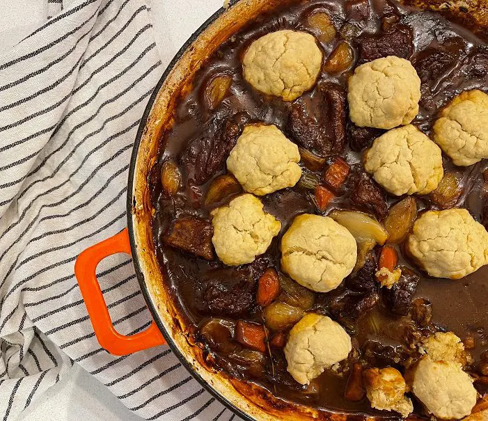 Delicious braised brisket in Guinness with steamed dumplings. It only takes 15 minutes to prepare and a few hours to cook in the oven – a great supper recipe to make in the day and slow cook for that evening.