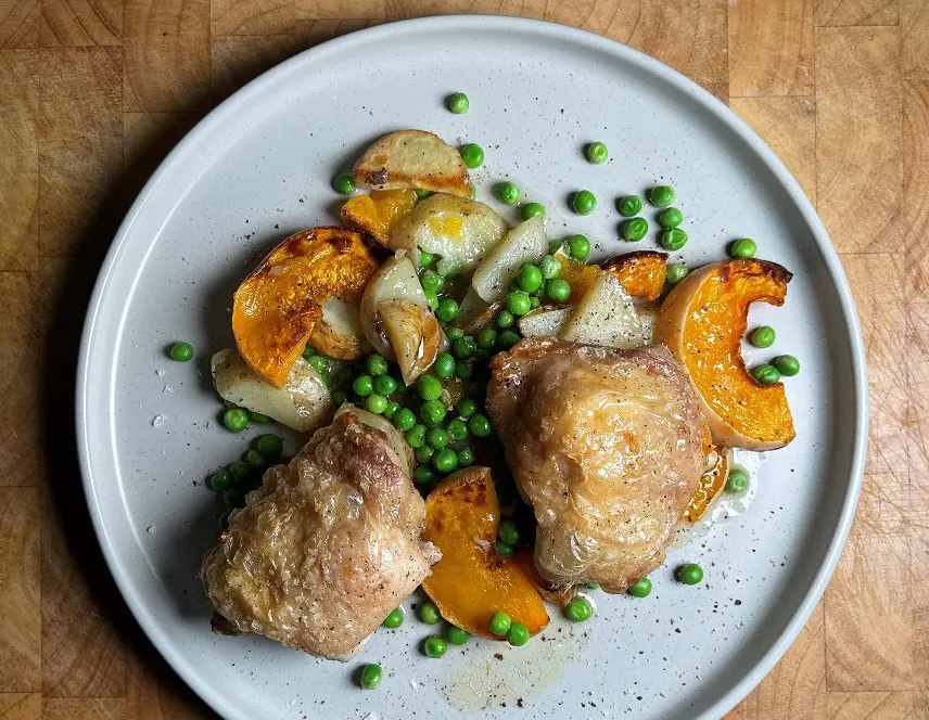 Jump to Recipe – Print Recipe Chicken Thigh and Butternut Squash Traybake Prep Time: 5 minutes minutesCook Time: 40 minutes minutesTotal Time: 45 minutes minutes Servings: 4 Great one tray dinner – perfect midweek comfort food! Crispy chicken thighs with sweet butternut squash all roasted together. Print Recipe Cost per portion 1.56 EquipmentPre-heated oven 200FAN/220cbaking tray 4 MetricUS Customary Ingredients8 chicken thighs500 g potatoes halved and sliced (5mm thick) 1 butternut squash2 red onion 1/2 inch slices3 cloves garlic left whole400 g petit pois2 tbsp gravy granules15 ml olive oil5 sprigs thyme0.5 tsp salt Instructions Prevent Sleep ModePrevent Sleep ModeTray BakeSlice the butternut squash into 1cm half moons (see below on how to prepare the squash) add to a large baking tray along with the garlic, potatoes, thyme and onions. Trim any excess fat from the chicken thighs and nestle them amongst the veg, make sure they are skin side up…