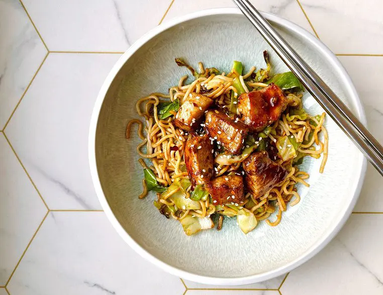 These crispy pork bites taste great and rest on stir fried noodles with sweetheart cabbage