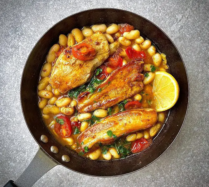 Jump to Recipe – Print Recipe Indian Spiced Pork Belly with Cannellini Beans Prep Time: 5 minutes minutesCook Time: 15 minutes minutesTotal Time: 20 minutes minutes Servings: 4 This is one of my go-to’s for something quick, full of flavour and delicious. The pork belly strips once trimmed can handle a high heat to brown them and complimented with the warming spices and good squeeze lime to cut through the richness. Print Recipe Cost per portion 2.46 Equipmentfrying pan 4 MetricUS Customary Ingredients1 kg pork belly strips fat trimmed1 red onion sliced3 cloves garlic sliced1 red chili sliced1 tbsp curry powder1 tsp garam masala0.5 tsp turmeric30 ml olive oil1 chicken stock cube2 tin cannellini beans 800g2 vine tomatoes sliced15 g fresh coriander chopped for garnish1 lime cut into wedges4 naan bread to serve Instructions Prevent Sleep ModePrevent Sleep ModeTrim any excess fat from the pork belly strips and dust in the…