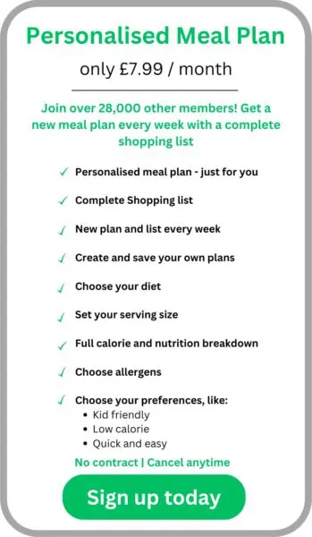 Choose Personalised meal plans to get a new meal plan every week tailored to your preferences (you can cancel anytime or revert to free). You can choose things like vegetarian, pescatarian or eat everything, specify allergens to avoid or simply your preferred style like kid friendly, quick and easy, low calorie and more! You also get access to our Exclusive Chef Hotline to text us for realtime help in the kitchen!