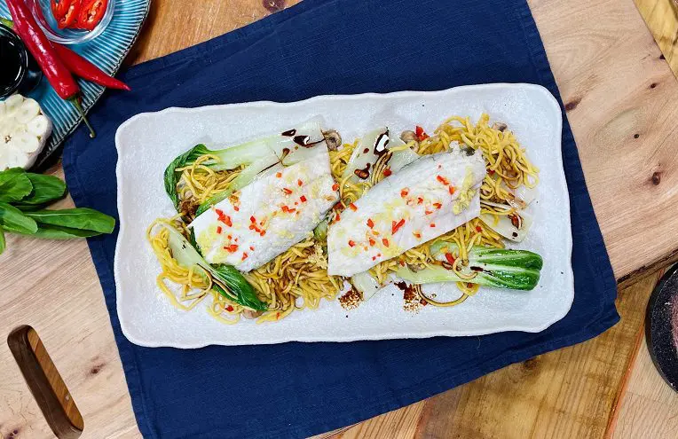 Super quick and delicious microwave seabass on oriental noodles – cooking fish in the microwave steams the fish which makes for a fast and tasty dinner! As seen on Channel 4